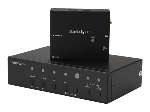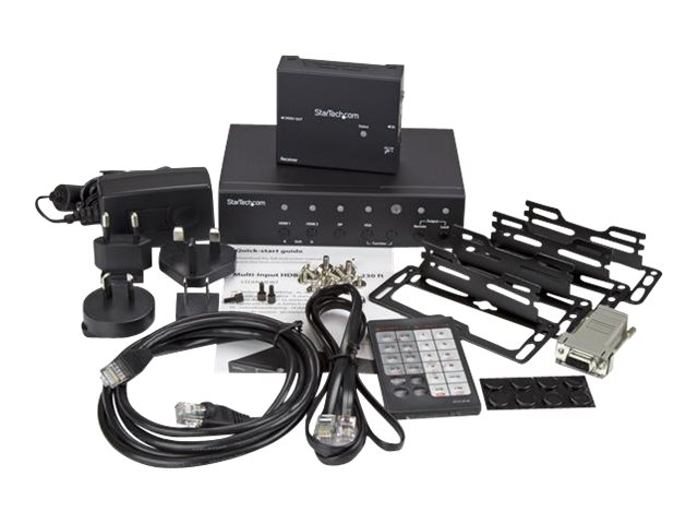 Ce kit d'extendeur vidéo multi-entrées utilise la technologie HDBaseT pour étendre vos signaux vidéo jusqu'à 70 mètres avec un seul câble CAT5e ou CAT6. Il intègre un commutateur vidéo vous permettant de choisir la source vidéo émise entre quatre sources vidéo indépendantes (2 sources HDMI, 1 source VGA et 1 source DisplayPort). L'extendeur vidéo prend en charge les résolutions vidéo Ultra HD 4K et Full HD 1080p, avec une prise en charge de l'audio 7.1 numérique associé.