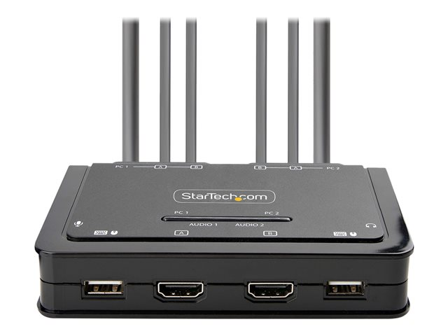 Ce commutateur KVM à deux moniteurs permet aux utilisateurs de basculer entre deux ordinateurs de bureau compatibles USB-A et HDMI, en partageant deux moniteurs HDMI 4K 60 Hz, un clavier et une souris, ainsi que des périphériques d'entrée/sortie audio.