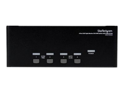 Le commutateur KVM USB DVI trois écrans à 4 ports SV431TDVIUA permet à 4 ordinateurs (comprenant chacun 3 sorties vidéo DVI) de partager des écrans, 1 microphone et 1 jeu de haut-parleurs, 1 clavier et 1 souris, ainsi qu'un périphérique USB 2.0 supplémentaire, comme un disque dur externe, une clé USB, une imprimante ou une webcam.