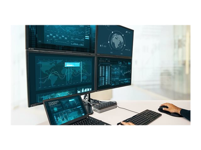 Augmentez votre productivité et vos performances grâce à la première station d'accueil universelle de qualité professionnelle au monde permettant de se connecter sur 4 écrans en 4K. Idéale pour les grandes entreprises, la station d'accueil Targus USB-C universelle 4 sorties vidéos 4K (QV4K) optimise l'affichage du poste de travail. La technologie DualDisplayLink DL-6910 prend en charge jusqu'à quatre écrans en DisplayPort (3 840 x 2 160 p60) ou HDMI (3 840 x 2 160 p50). La station d'accueil comprend de nombreux ports supplémentaires pour vous permettre de connecter vos périphériques USB 3.0 essentiels et votre réseau Ethernet.