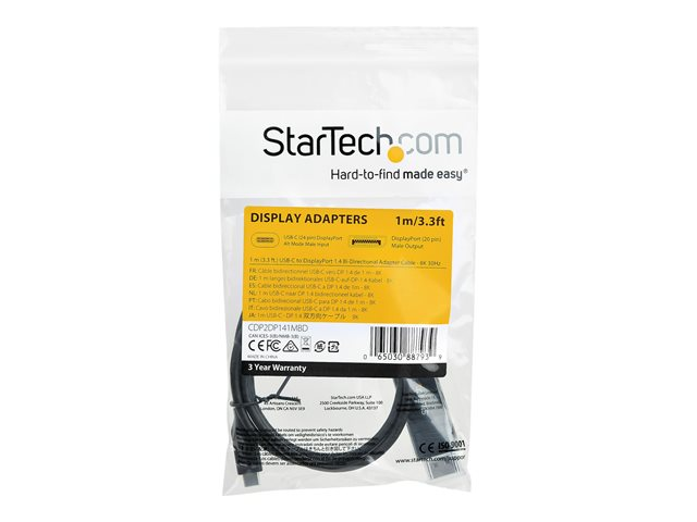 StarTech.com 3ft/1m USB C to DisplayPort 1.4 Cable 8K 60Hz/4K, Bidirectional DP to USB-C or USB-C to DP Reversible Video Adapter Cable, HBR3/HDR/DSC, USB Type C/Thunderbolt 3 Monitor Cable - 8K USB-C to DP Cable (CDP2DP141MBD) - Câble DisplayPort - 24 pin USB-C (M) pour DisplayPort (F) - USB 3.1 / Thunderbolt 3 / DisplayPort 1.4 - 1 m - actif, support pour 8K UHD (7680 x 4320) - noir CDP2DP141MBD