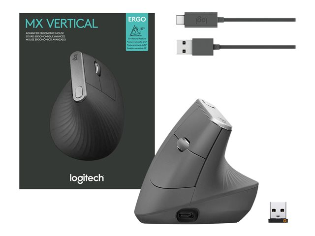 Logitech MX Vertical - Souris verticale - ergonomique - optique - 6 boutons - sans fil, filaire - Bluetooth, 2.4 GHz - récepteur sans fil USB - graphite
