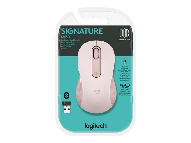 Logitech Signature M650 L - Souris - grande taille - optique - 5 boutons - sans fil - Bluetooth, 2.4 GHz - récepteur USB Logitech Logi Bolt - rose