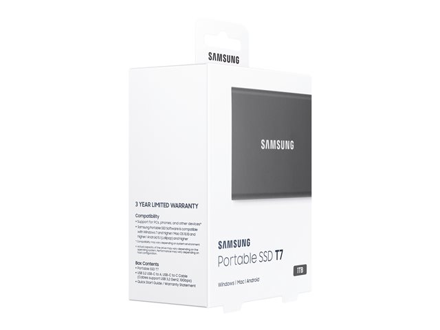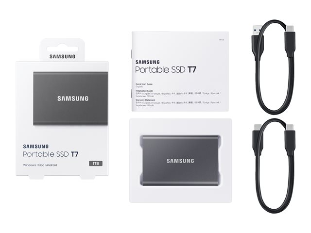 Samsung T7 MU-PC1T0T - SSD - chiffré - 1 To - externe (portable) - USB 3.2 Gen 2 (USB-C connecteur) - AES 256 bits - gris titan