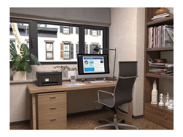Cette imprimante jet d'encre multifonction élégante, compacte et facile d'utilisation peut réduire le gaspillage et les coûts avec l'impression recto verso A4 et des cartouches d'encre séparées économiques. Grâce au chargeur automatique de documents, la technologie Scan-To-Cloud et le grand écran LCD de 6,1 cm, vous pouvez numériser, copier ou faxer plusieurs pages d'affilé de manière rapide et simple. L'impression en déplacement est aisée grâce au Wi-Fi, Wi-Fi Direct, Epson Connect et Apple AirPrint .
